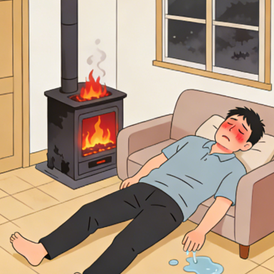 煤炉、炭火取暖,房间密闭。
