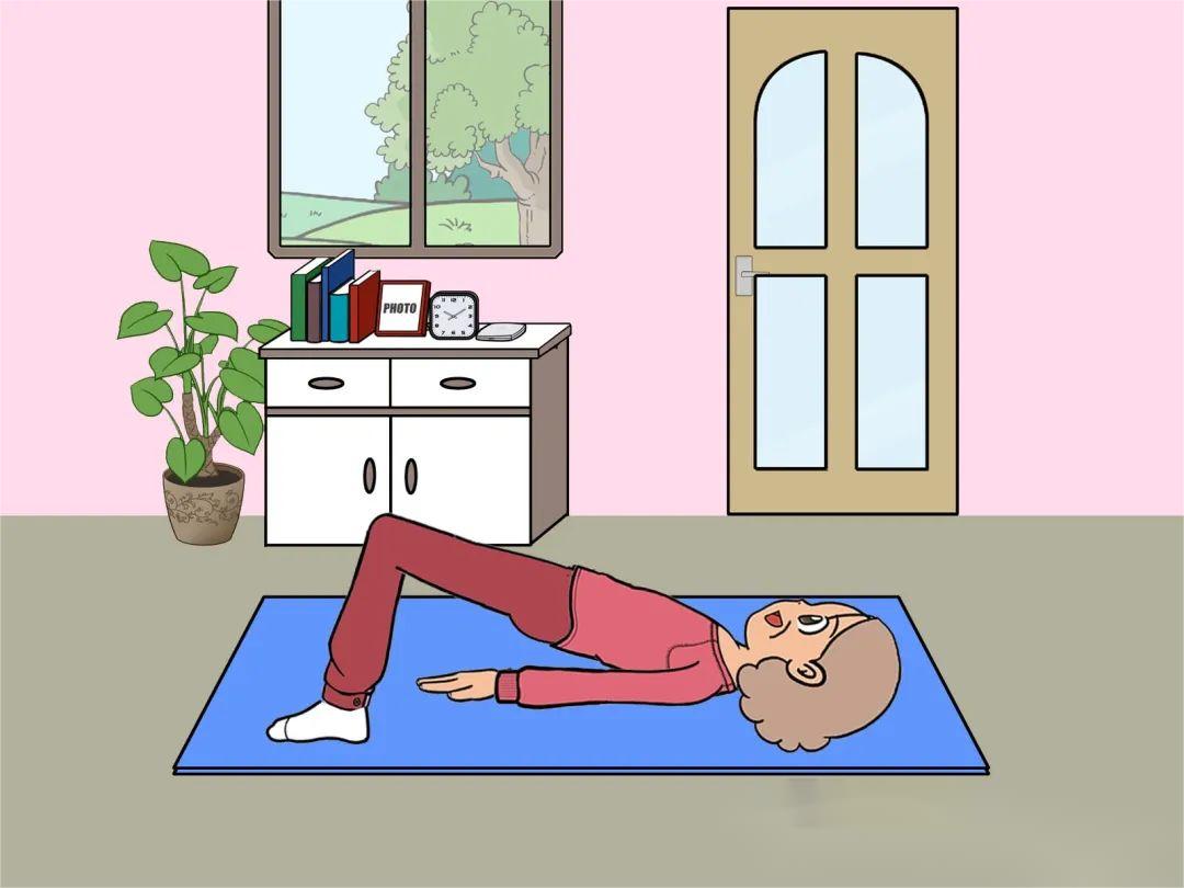 · 仰卧位,双膝屈曲后抬臀,维持3秒,进行桥式运动;