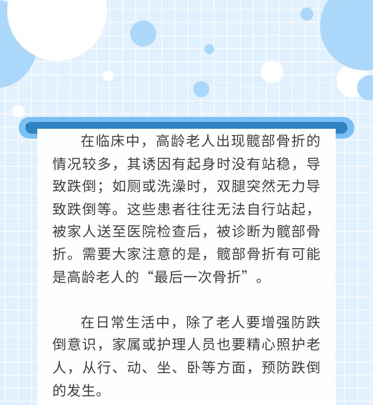 然而,老年患者的各个器官功能均有退化,且常合并多种基础疾病。有些疾病可能会影响手术时机,而骨折也可能加重基础疾病的病情。部分老年髋部骨折患者因存在心血管疾病、肺功能减退、肾功能不全等情况,无法及时进行手术,甚至有些患者在等待手术过程中死亡。因此,预防骨折的发生就显得尤其重要。
