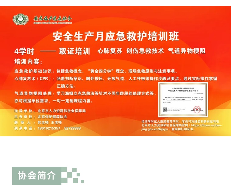 北京保护健康协会作为市民政局 4A 级社会组织、市人力资源和社会保障局专业技术人才继续教育基地,以服务国家、服务大众、服务会员和提升专业技术人才知识水平为己任,汇聚专家智慧,建设行业智库,开展国际交流合作和多元化定制培训课程。