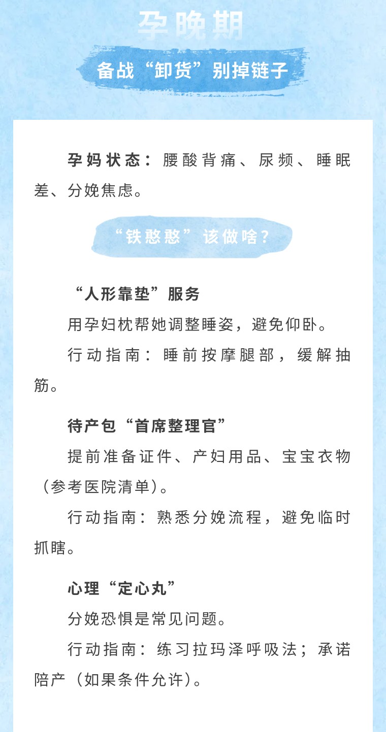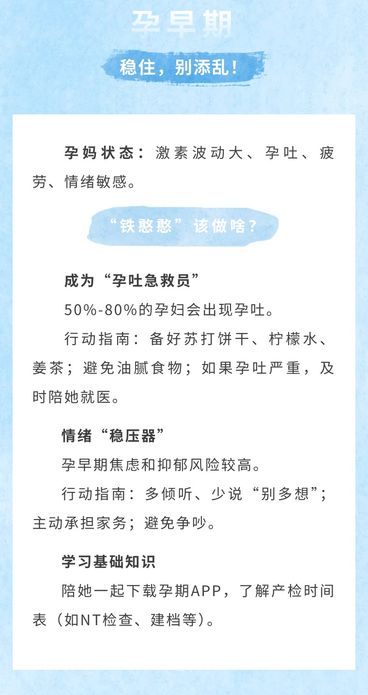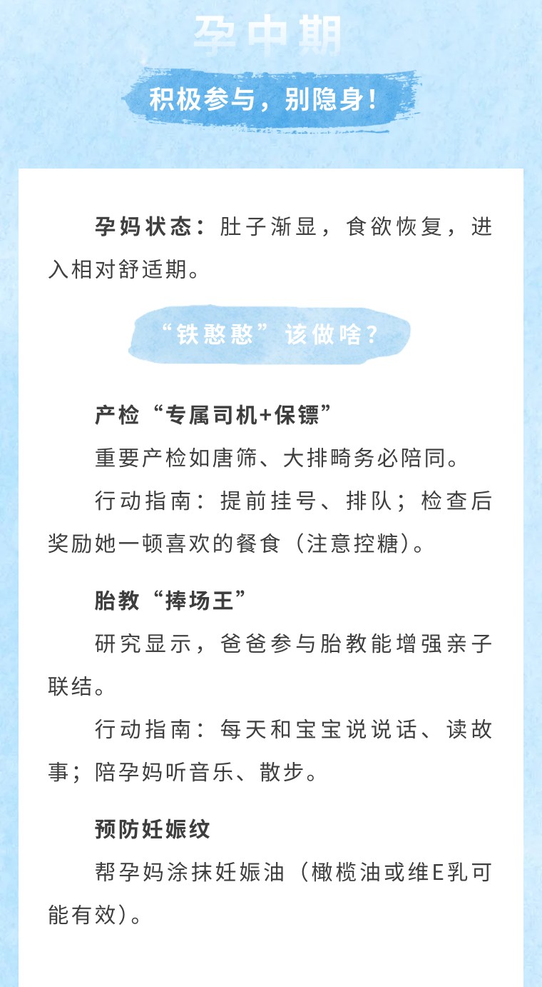 孕期是夫妻共同成长的旅程,“铁憨憨”的每一份付出,都会让孕妈更安心、宝宝更健康!转发给那个“他”,一起升级为满分队友吧!
